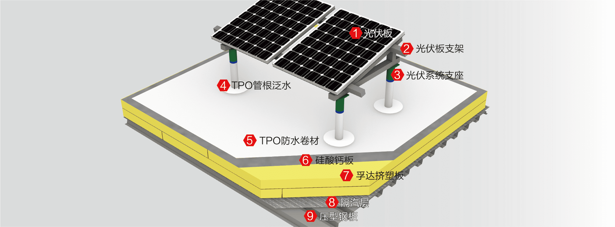 依托于TPO防水卷材的優異防水性能及耐久性,在TPO單層柔性屋面上直接安裝的分布式光伏發電系統。在屋面預留的圓管短柱作為光伏系統的基座,檁條上設置鋼板+隔汽層+XPS板+無極防火板+TPO卷材,基座上架設光伏支架和光伏板。